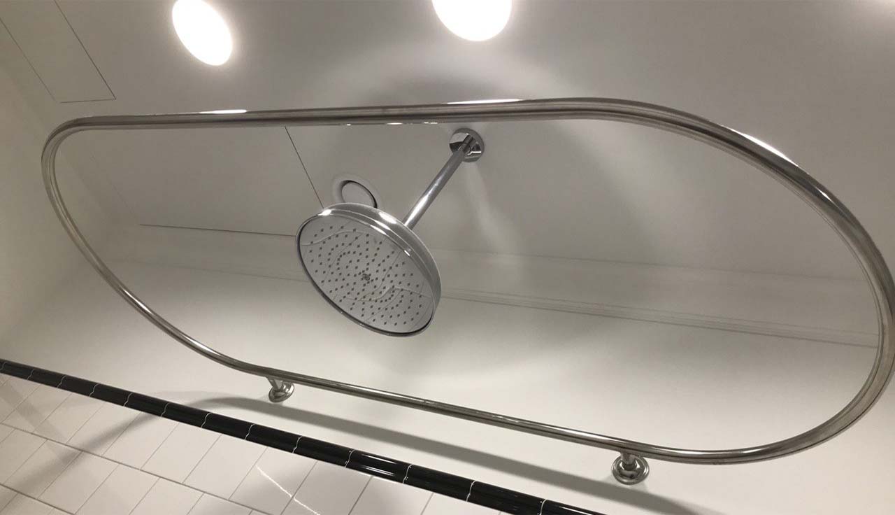 Карниз в форме замкнутого овала позволяет закрыть ванну шторками с трех сторон и разместить душевую стойку в середине.